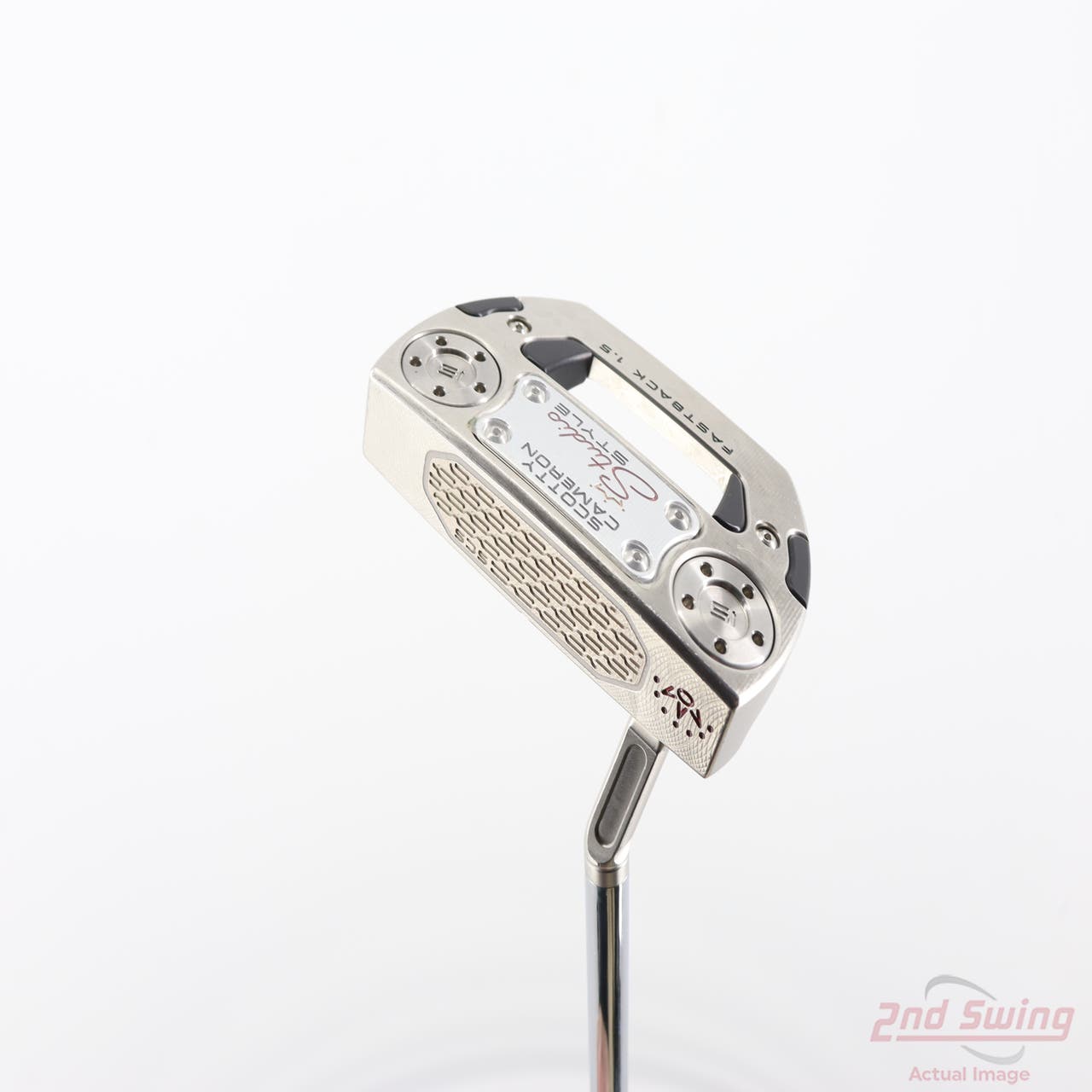 The Titleist Scotty Cameron 2025 Studio Style Fastback 1.5 putter is a redesigned mid-mallet offering that blends the feel of a blade with the performance of a compact mallet. Distinguished by its I-beam jet neck, which promotes toe flow, this putter is precision milled from 303 stainless steel and incorporates a 6061 aircraft aluminum sole plate and a black anodized aluminum heel-toe inlay for optimized weight distribution, increased MOI, and enhanced alignment. The Studio Carbon Steel (SCS) face insert, featuring an electroless nickel plating for durability, combined with the new chain-link face milling technology, provides a soft sound and feel with improved roll characteristics. A re-engineered sole draft angle ensures the putter sits square at address. Customizable stainless steel sole weights allow for personalized balance. The Fastback 1.5 also features signature translucent red cherry dots and an engraved 7 Point Crown. Available in both right and left-handed options, this multi-material construction putter offers a modern, rounded design with improved alignment, soft sound, and a balanced feel.