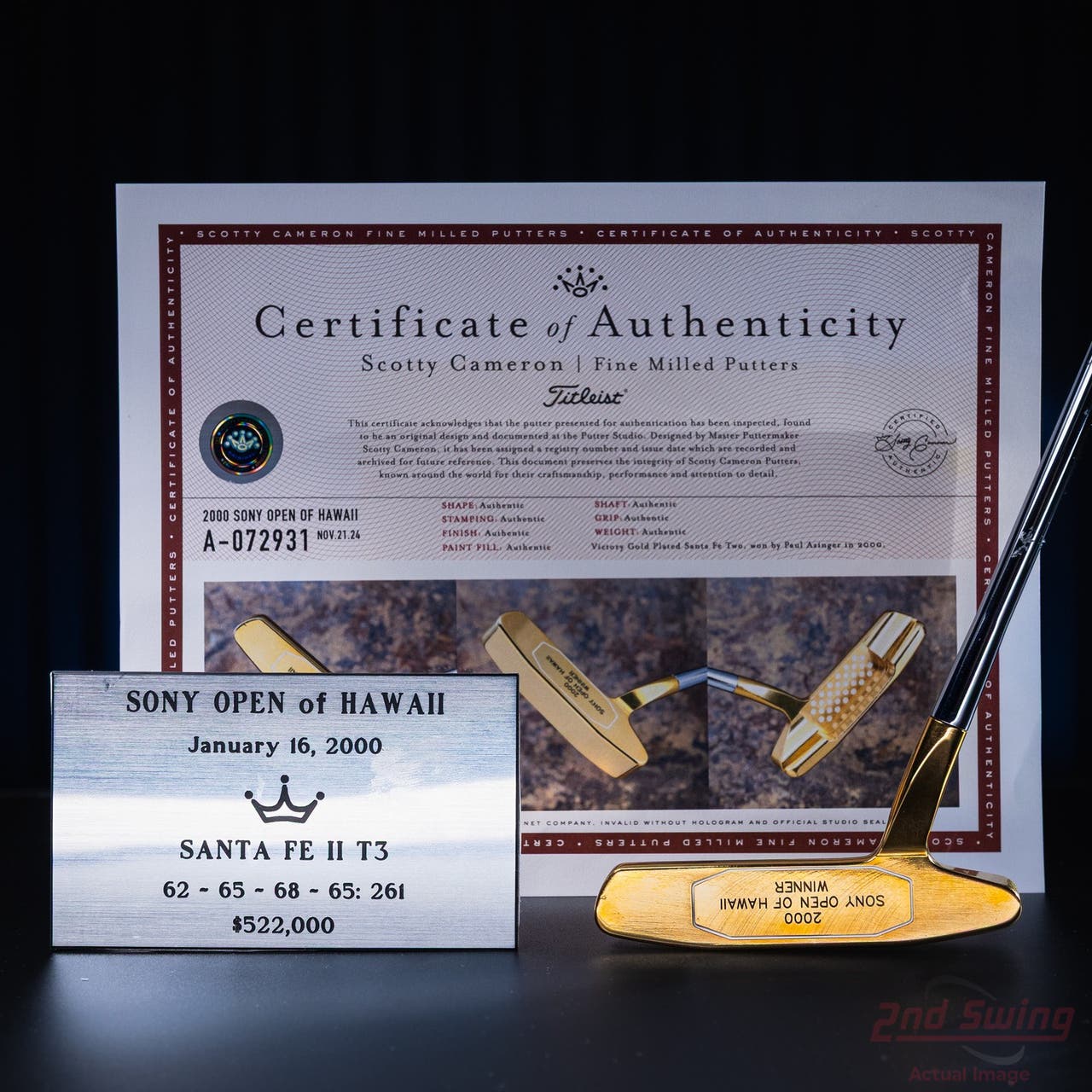 Mint Titleist Scotty Cameron Gold Plated Paul Azinger 2000 Sony Open Victory Putter Right Handed W/ COA & Name Plate (D-32543885605)